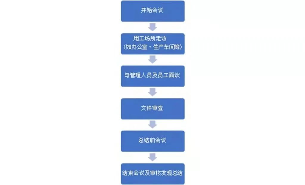 SMETA驗廠審核與常見的質(zhì)量審核或財務(wù)審計在流程上基本相同,主要包括現(xiàn)場訪問、員工面談以及文件審核,具體流程請參考下圖: