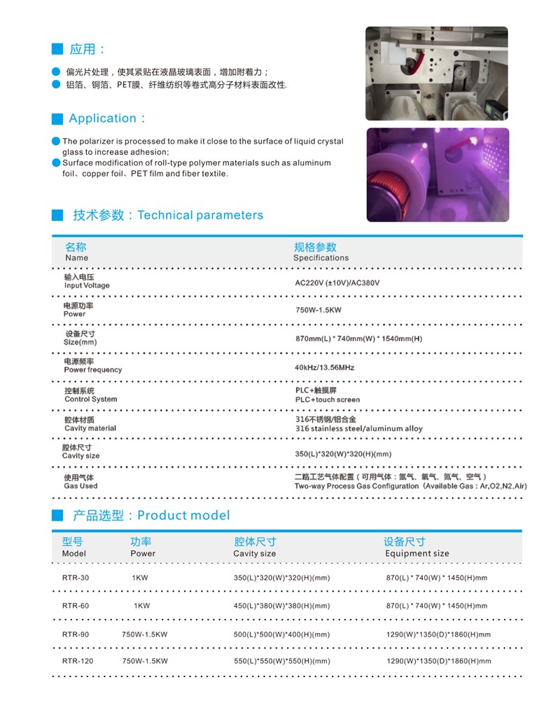 1. 管狀電結(jié)構(gòu),放電不受被處理物形態(tài)影響,處理均勻,使用不同張力產(chǎn)品處理,運(yùn)動(dòng)速度可調(diào)節(jié),實(shí)現(xiàn)正反轉(zhuǎn)4. 合理的等離子反應(yīng)空間,使產(chǎn)品處理更均勻